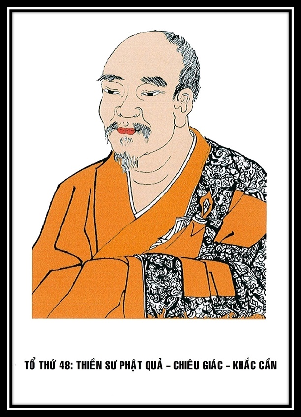 1. Thiền sư Khắc Cần ở Chiêu giác. Thiền sư Khắc Cần - Phật Quả ở chùa Chiêu giác tại phủ Thành đô. Vốn người dòng họ Lạc ở Bành châu, gia đình Sư nhiều đời kính sùng Nho giáo. Từ thủa thơ bé, mỗi ngày Sư đọc nhớ cả ngàn lời, chợt đến tham quan chùa Diệu tịch, thấy kinh sách Phật, ba lần trở về Sư buồn bã như được vật xưa cũ, tự bảo là: “Tôi ngờ trong quá khứ từng làm Sa-môn vậy”. Sư bèn bỏ gia đình nương theo tự tỉnh mà xuống tóc xuất gia, Sư lại nương theo Sa-môn Văn Chiếu mà thông rành giảng thuyết, lại theo Sa-môn Mẫn Hạnh mà được truyền trao cho kinh Lăng Nghiêm. Bỗng chốc Sư cảm mắc bệnh đến nỗi sắp chết, mới tự than rằng: “Ðường chánh Niết-bàn của chư Phật chẳng ở trong văn cú. Tôi vì muốn dùng tiếng để cầu, dùng sắc để thấy, nên đó không lấy làm chết vậy”. Sư bèn giã từ đó, đến nương tựa nơi pháp tịch của Thiền sư Thắng ở Chân giác, Thiền sư Thắng chích cánh tay ra máu mà chỉ cho Sư và bảo: “Ðây là một giọt của Tào Khê vậy”. Sư kinh sợ, ngưng giây lát mới nói: “Ðạo hẳn như vậy ư?” Và liền dời bước ra đất Thục đến bái yết Thiền sư Hạo ở Ngọc tuyền, tiếp đến nương tựa Thiền sư Tín ở Kim loan, Thiền sư Triết ở Ðại quy, Thiền sư Tâm ở Hoàng long, Thiền sư Ðộ ở Ðông lâm. Các vị ấy đều chỉ Sư và bảo là Pháp khí và Thiền sư Hối đường xưng gọi Sư là “Ngày sau một phái Lâm Tế riêng tại nơi con vậy”. Cuối cùng, Sư đến bái yết Thiền sư Diễn ở Ngũ tổ, dốc hết cơ dụng mà Thiền sư Diễn vẫn không chấp thuận, Sư mới nói Thiền sư Diễn là gượng đổi thay người”. Thiền sư Diễn vẫn không theo lời, Sư bèn tức giận mà bỏ đi. Thiền sư Diễn bảo: “Ðợi ông dính một chút bệnh nóng, lúc đánh mới nghĩ lường đến ta”. Sư đến Kim lăng hái củi, cảm mắc bệnh thương hàn rất lắm, lấy điều thấy của ngày bình thường mà thử đó nhưng không đắc lực, mới nghĩ gỡ lời của Thiền sư Diễn, bèn tự phát lời thề rằng: “Bệnh tôi được thuyên giảm chút ít tức sẽ trở về Ngũ tổ”. Khi bệnh có phần giảm bớt, Sư tìm trở về. Thiền sư Diễn trông thấy Sư, vui mừng mà bảo Sư vào tham đường. Sư bèn vào theo hầu trong Liêu mới được nửa tháng gặp bộ Sứ giả mở ấn trở về đất Thục, đến ngũ Tổ hỏi Ðạo. Thiền sư Diễn bảo: “Thủa thiếu niên Ðề Hình từng đọc thơ Tiểu Diễm chăng? Trong đó có hai câu rất gần nhau là “Tằng gọi Tiểu Ngọc vốn vô sự, chỉ cần Ðàn Lang nhận được tiếng”. Ðề Hình liền ứng tiếng thưa: “Kính vâng”. Thiền sư Diễn bảo: “Hãy nên tử tế”. Sư vừa về đứng hầu lần sau đó mới hỏi là: “Nghe Hòa thượng nêu cử thơ Tiểu Diễm, Ðề Hình có hiểu được chăng?” Thiền sư Diễn bảo: “Kia đã nhận được tiếng”. Sư thưa: “Chỉ cần Ðàng Lang nhận được tiếng, mà kia đã nhận được tiếng, lại vì gì tức chẳng phải?” Thiền sư Diễn hỏi: “Thế nào là đại ý của Tổ sư Ðạt-ma từ Tây vức lại? Hình dáng cây bách trước sân?” bỗng nhiên Sư có chút tỉnh ngộ. Vội đi ra, thấy gà bay trên lan can cổ vũ mà kêu, lại tự cho là: “Ðây há chẳng phải là tiếng?” Bèn tụ hương vào thất, thông rành điều chứng đạt, mới trình kệ tụng rằng: “Hương kim giáp tiêu màn gấm lụa, sênh ca trong rừng say đổ về, tuổi trẻ một việc phong lưu, chỉ hẹn người đẹp riêng tự biết”. Thiền sư Diễn bảo: “Việc lớn của Phật tổ thì hàng tiểu căn lực kém không thể đến được. Ta giúp cho ông được tốt lành vậy”. Và Thiền sư Diễn nói cùng khắp các bậc kỳ cựu trong núi là: “Thị giả của ta tham đã đắc Thiền vậy”. Từ đó, phàm đến đâu, mọi người đều suy xưng Sư là Thượng thủ. Trong khoảng niên hiệu Sùng Ninh (1102-1107) thời Bắc Tống, Sư trở về quê nhà, bốn chúng đều đua nhau ra kính bái. Thành đô soái Hàng lâm Quách Công Tri Chương thỉnh mời sư khai đường giảng pháp ở Lục tổ, lại ở Chiêu giác. Ðến trong khoảng niên hiệu Chánh Hòa (1111-1118) thời Bắc Tống, Sư từ tạ mọi sự ở đó, ra đường núi theo hướng Nam vân du. Bấy giờ, Trương Vô Tận đang ngụ ở kinh Nam, dùng đạo học tự sống, ít thấy suy hứa. Sư men thuyền con đến đó ra mắt, cùng nhau kịch liệt đàm nói về yếu chỉ của kinh Hoa Nghiêm rằng: “Với Hoa Nghiêm, cảnh giới hiện lượng, lý sự toàn chân, mới đầu không một mảy may gá pháp. Do đó tực một mà gồm cả muôn, rõ muôn mà một, một lại một, muôn lại muôn, rõ ràng chẳng cùng, tâm, Phật, chúng sinh cả ba vốn không sai biệt, co duỗi tự tại, vô ngại viên dung. Ðó tuy là khuôn phép rốt cùng, nhưng trọn là không gió mà sóng dập nổi quanh”. Khi ấy Trương Vô Tận bất chợt xúc chạm vào giường, Sư bèn hỏi là: “Ðến đây cùng với ý của Tổ sư Ðạt-ma từ Tây vức lại là đồng hay khác?” Trương Vô Tận đáp: “Ðồng vậy”. Sư bảo: “Tạm bị chìm dắm giao thiệp”. Trương Vô Tận tỏ 
